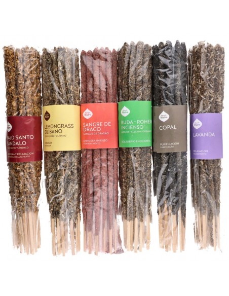 HARMONY AND RELAXATION. COMPOSITION: Palo Santo (Peru), lavender flowers, lavender essential oil, fruit biomass, charcoal, natural binder and salt.