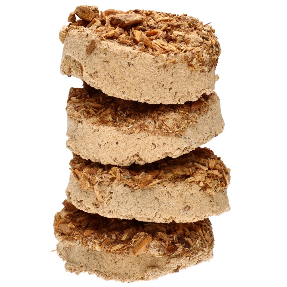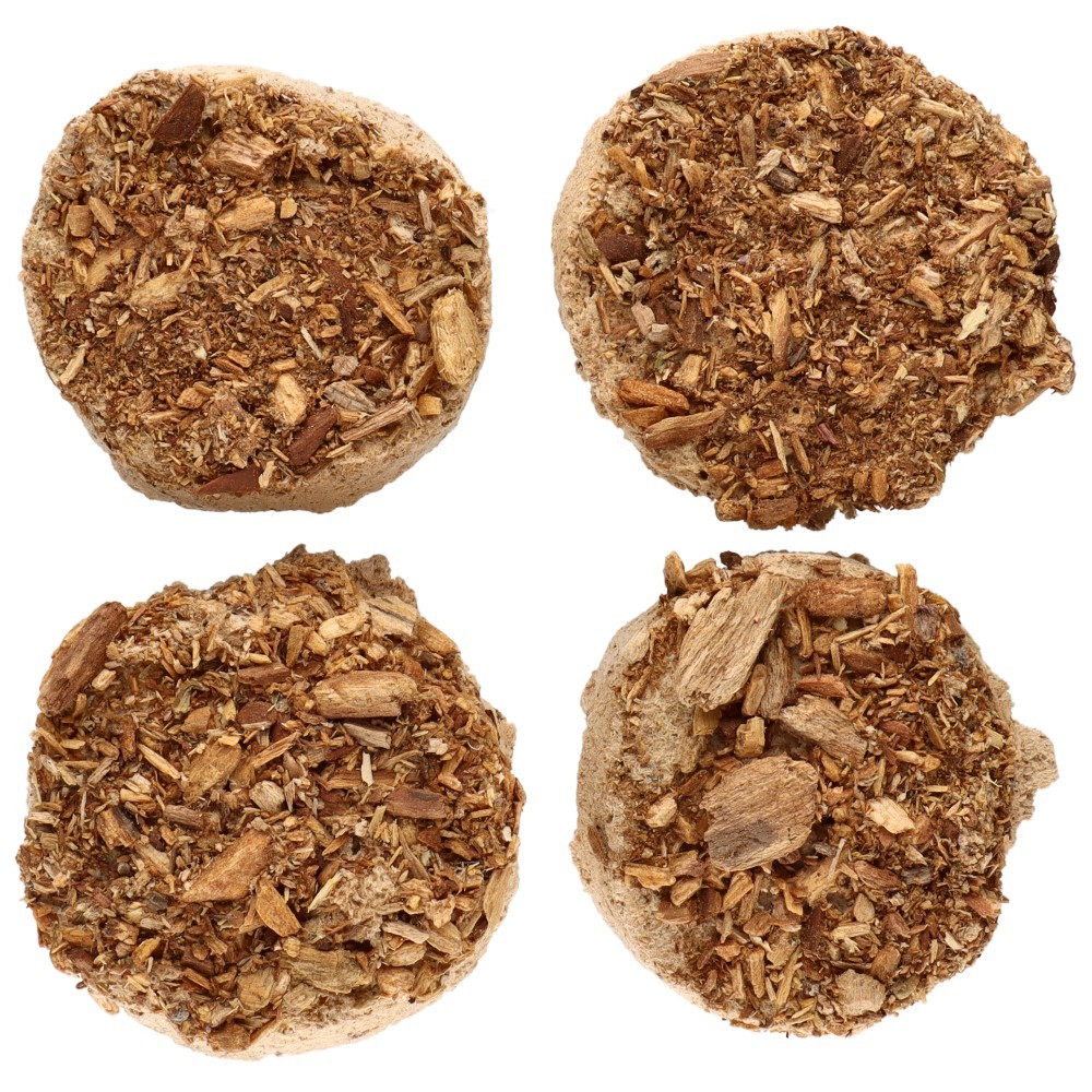 Chaque boîte contient quatre disques de charbon de bois prêts à l'emploi, surmontés de feuilles de rue (4 cm de diamètre)