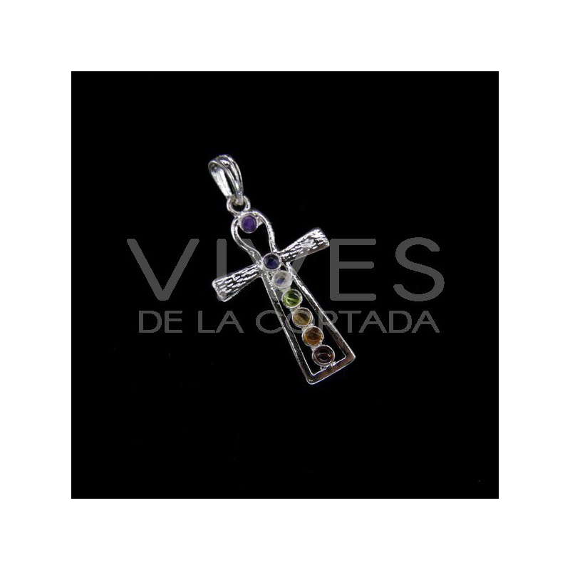Pendentif croix égyptienne avec minéraux de chakra - plaqué argent