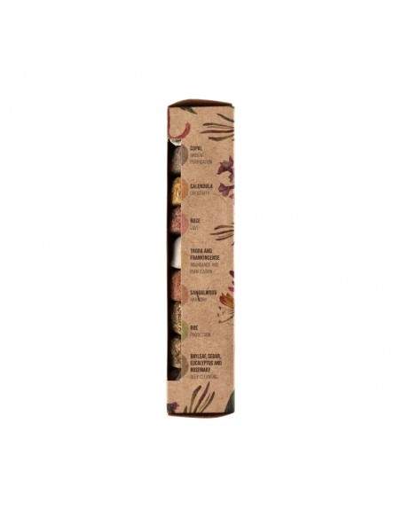 Cada caja contiene 7 discos de carbón coronados con flores y hierbas