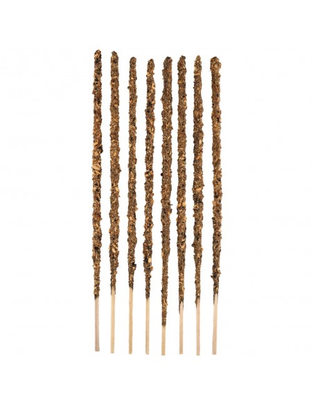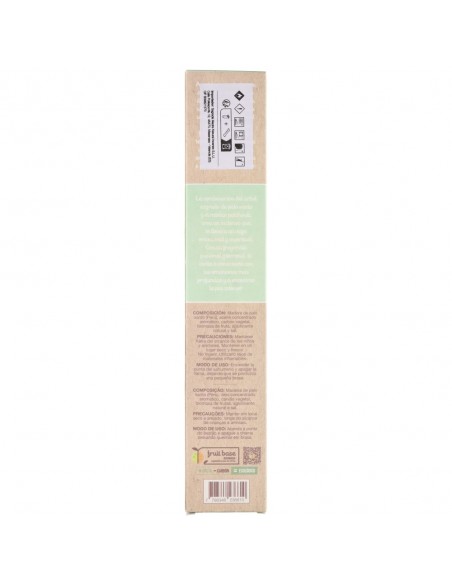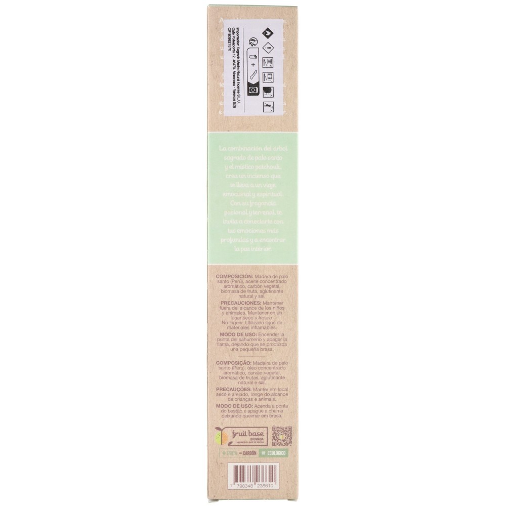 Composición: Madera de palo santo (Perú), aceite concentrado aromático, carbón vegetal, biomasa de fruta, aglutinante natural y sal.