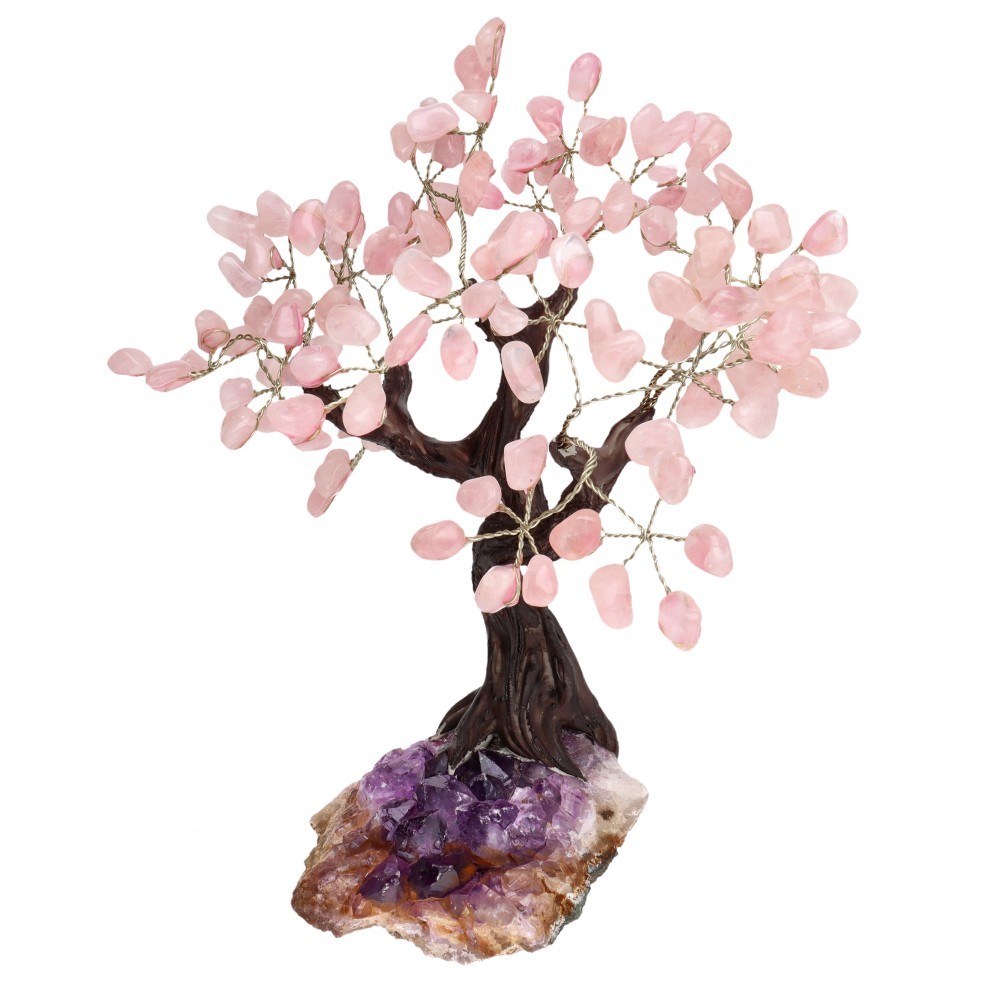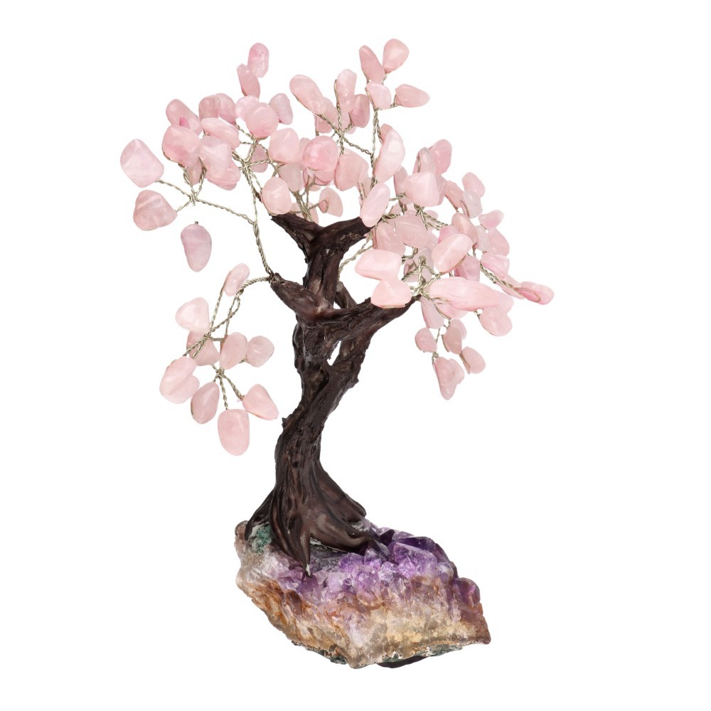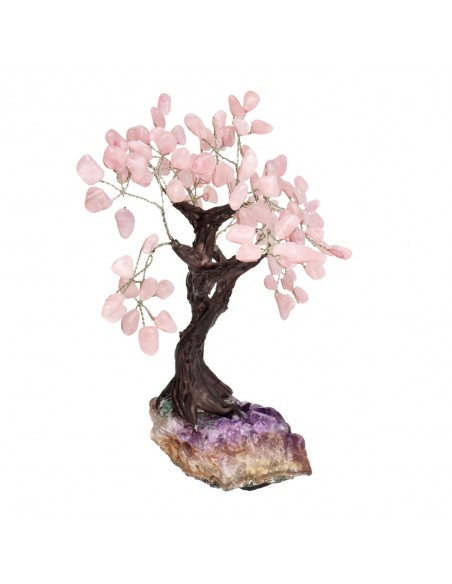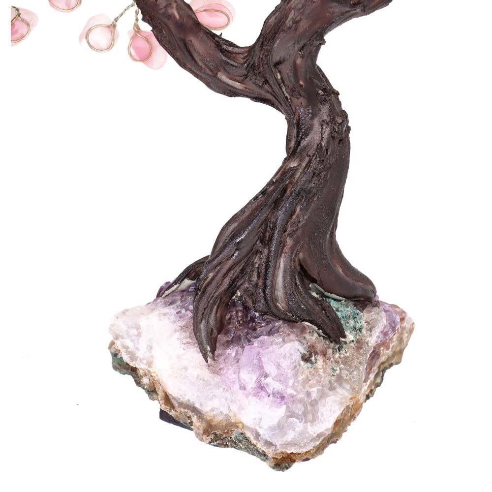 Árbol de Cuarzo Rosa Mediano con Base de Drusa Amatista