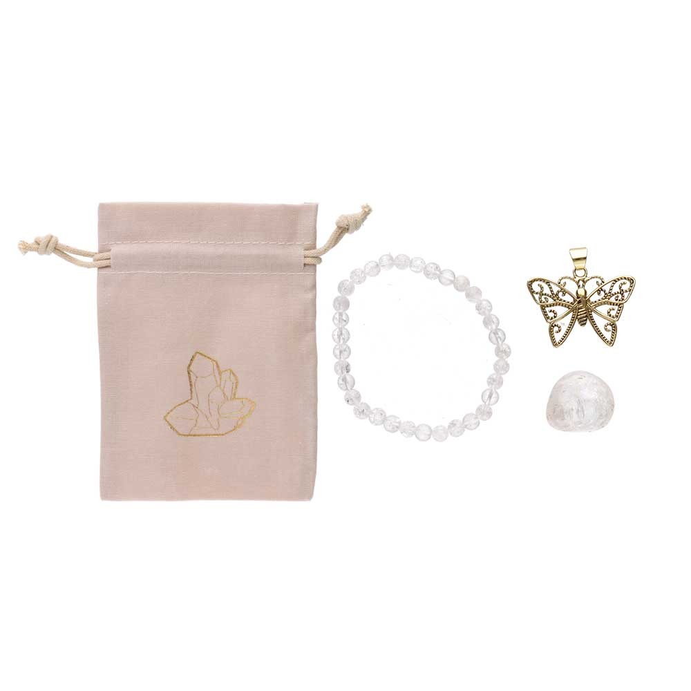 El cuarzo blanco ayuda a potenciar esta simbología y a orientar la energía necesaria para transformarnos de crisálida a mariposa.