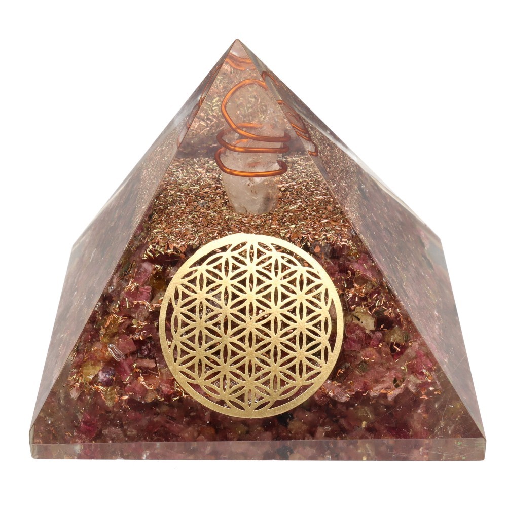 Pirámide Orgonita de Turmalina Rosa en Resina con Flor de Vida 7x7cm