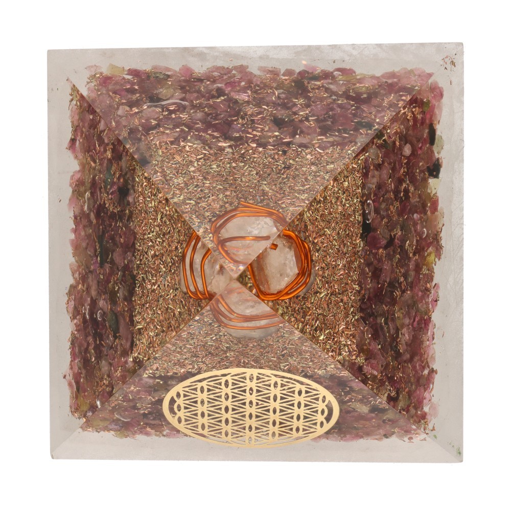 Pirâmide de turmalina rosa Orgonite em resina com flor da vida 7x7cm